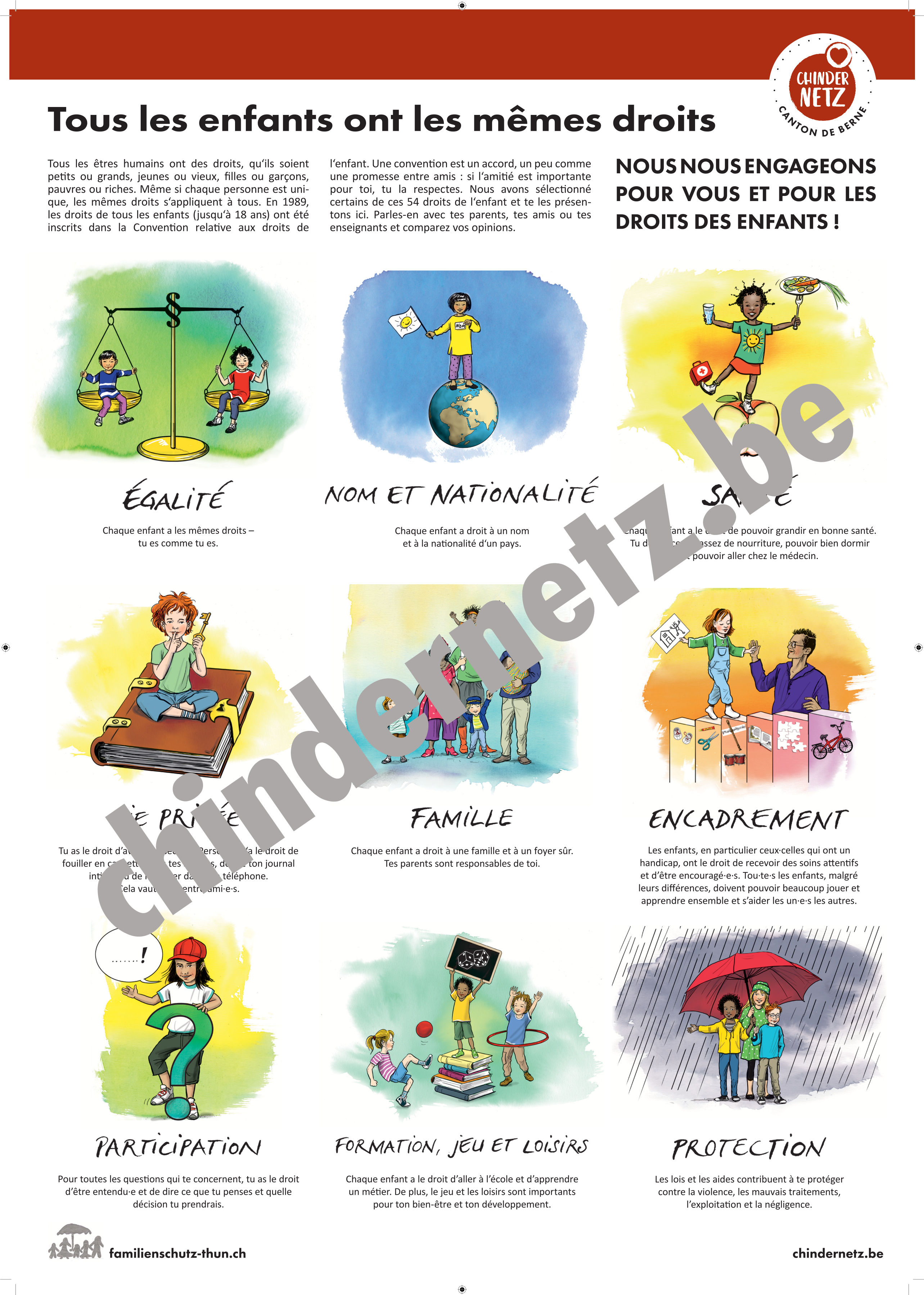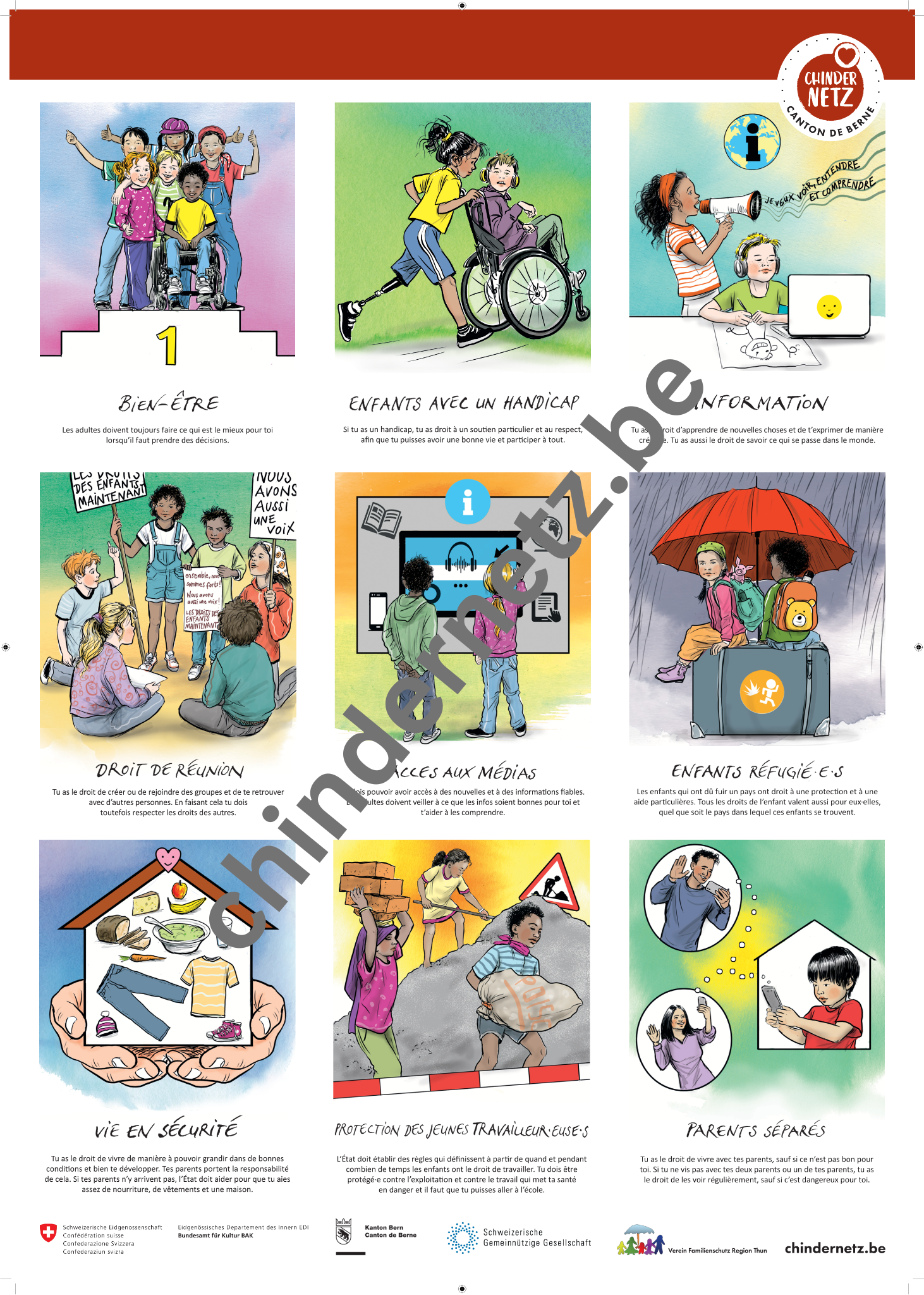Chindernetz Kanton Bern rend les droits de l'enfant visibles grâce à des affiches et des cartes postales ! 25 des 54 droits de l'enfant sont expliqués de manière compréhensible pour les enfants et illustrés sur 2 affiches (A2) et 18 cartes postales (A5).